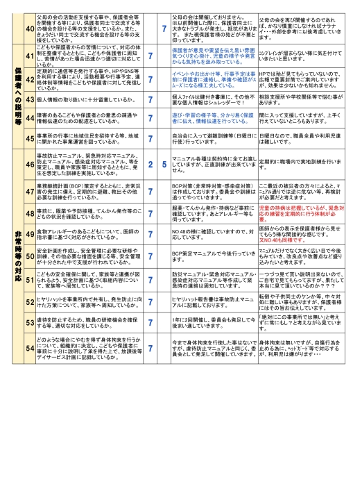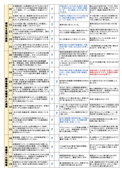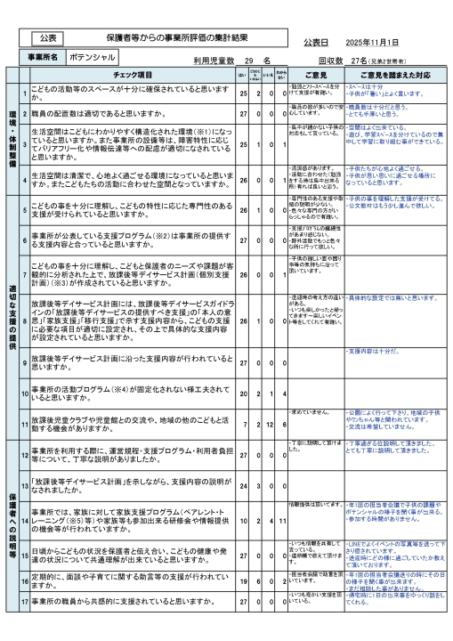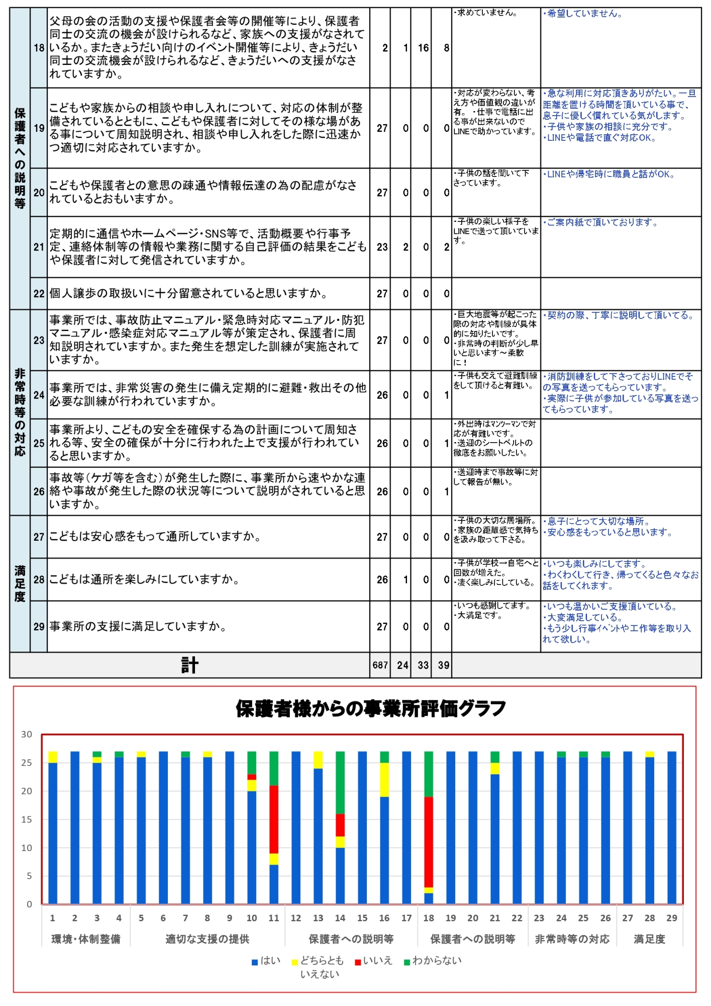 ご利用頂いている利用者様(保護者様)にアンケート調査をお願いし、弊所の評価を頂きました。コメントを頂いている利用者様のご意見を出来る限り改善点としてすすめていきたいと思います。